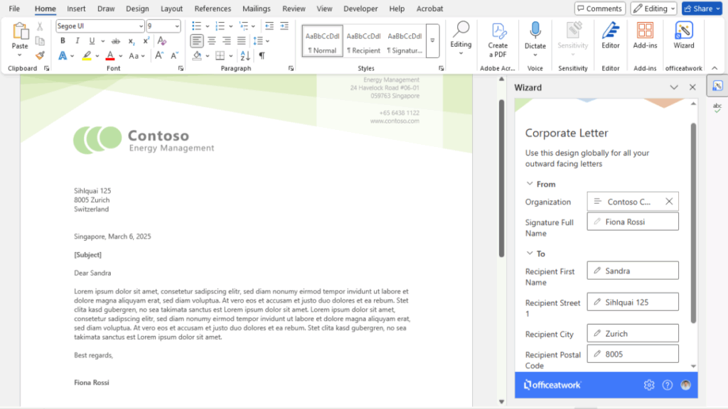 Sorge für ein einheitliches Erscheinungsbild Deiner Dokumente. officeatwork stellt sicher, dass alle erzeugten Inhalte im Corporate Design bleiben – professionell, aktuell und markenkonform.